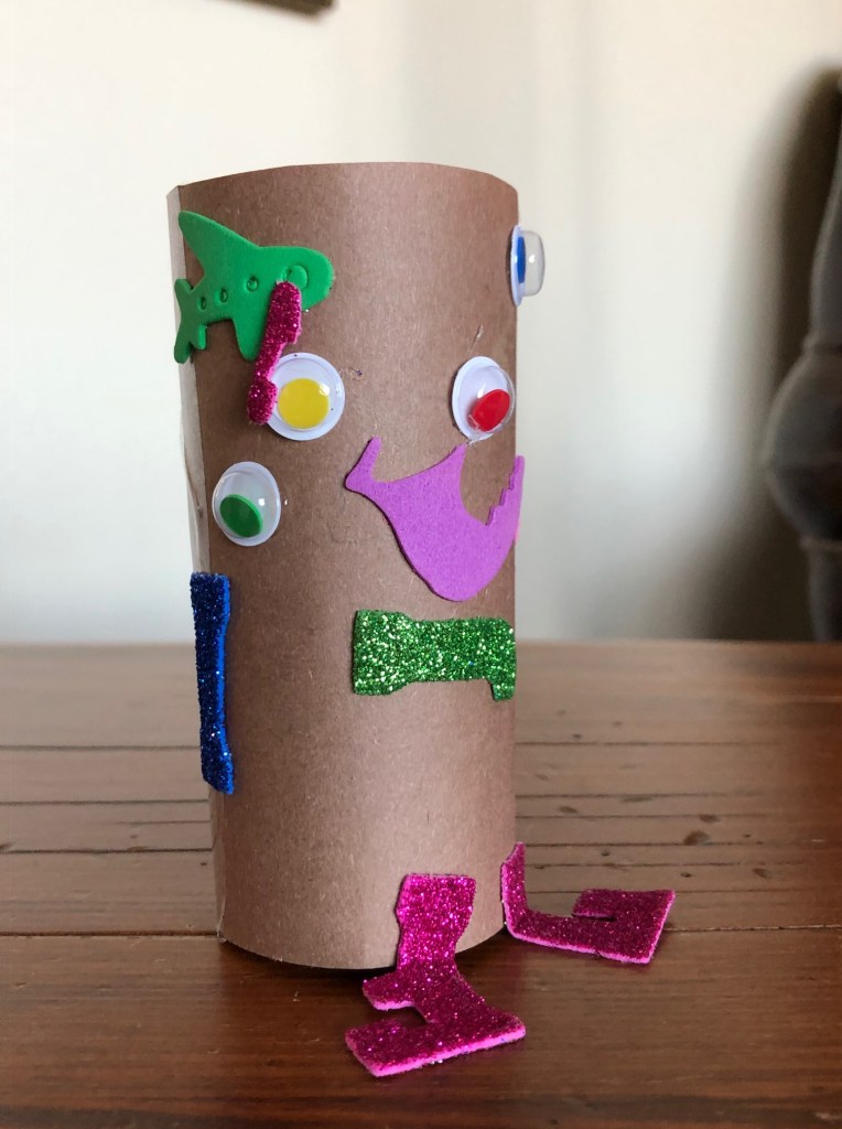“Sure,” I answer, handing him the third brown-papered roll. He reaches into the supplies and gathers his fixings. I hand him a box of sparkly stickers because his little hands can manage them. He’s smitten with the googly eyes and amasses them in different colors.