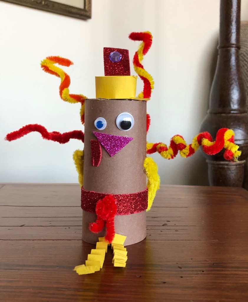 Before the grandchildren decorate their turkeys, I cover each roll with brown construction paper. On the day of our class, I sprinkle the table with scissors, glue, pipe cleaners, googly eyes, construction paper, stick-on faux gems, glitter foam sheets, popsicle sticks, and stickers. They eye the smorgasbord of craft supplies, eagerly waiting for permission to dig in.