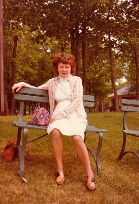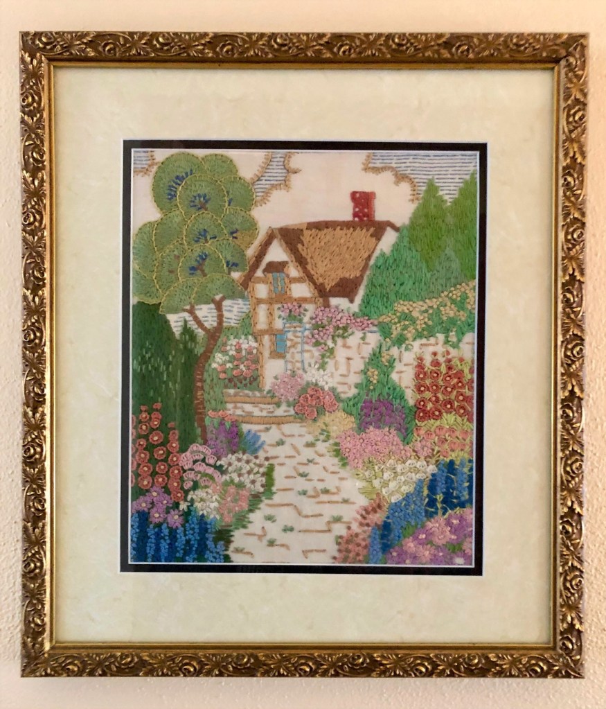 Before she sat on the park bench, where someone snapped this picture, she would’ve dressed in her tiny pink bathroom, a fascinating place to me because of its laundry chute and the intricately embroidered scene of an English cottage and garden that hung on the wall. My sisters and I surreptitiously tossed toys down the chute, then skedaddled to the basement to retrieve them from the laundry basket until Nana said, “Stop the shenanigans!” The embroidered scene was a gift from her oldest sister Margaret. Nana didn’t do crafts; although in her sixties, she took a watercolor class and painted flowers and butterflies—but not convincingly.