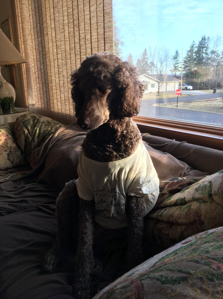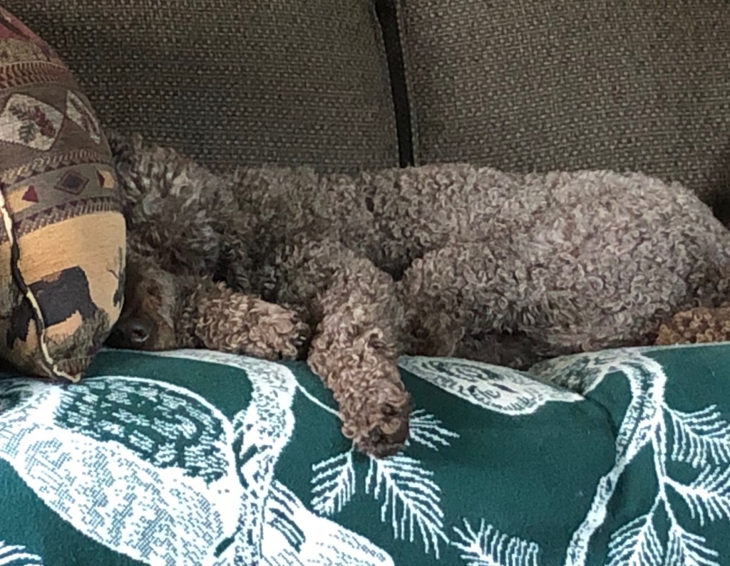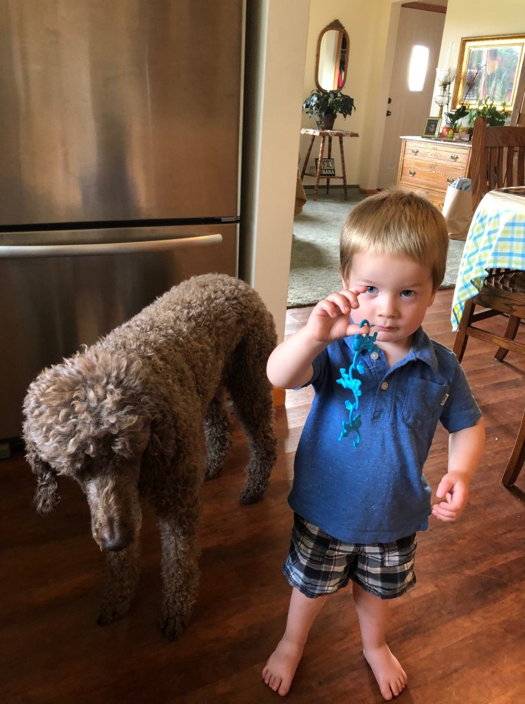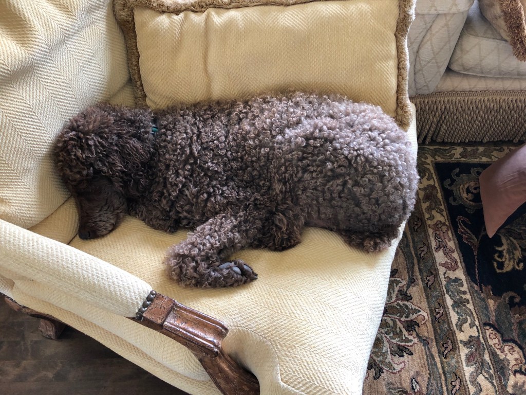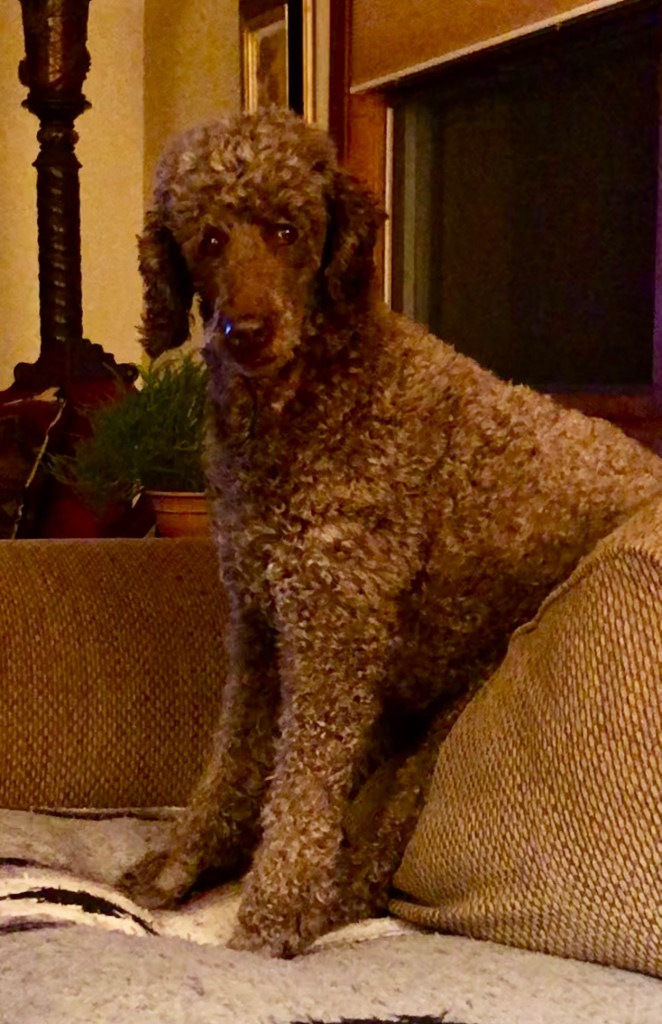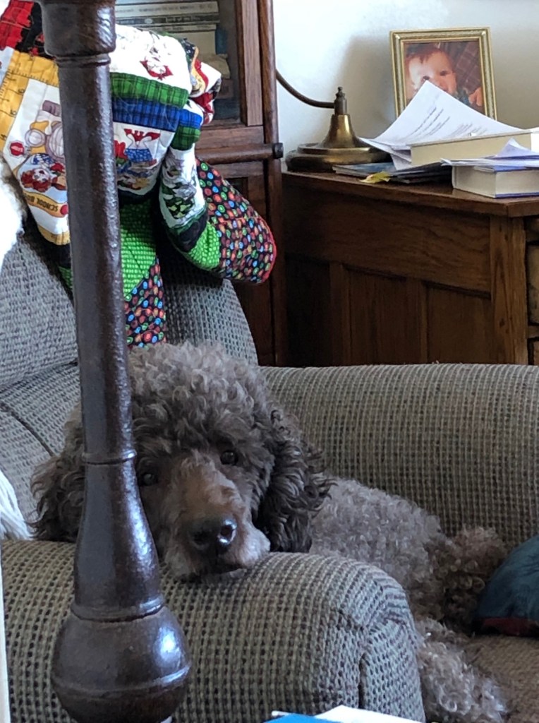 When my son comes to visit, she likes to have a silent moment with him. He puts his face near hers, and she looks at him intently. Sometimes my son speaks to her, and sometimes it’s just a wordless exchange. He was the one who picked her up out of a small pen and held her. She nuzzled under his chin. He asked us to take her home. So, we did because who can resist an eighteen-year-old boy who adores a chocolate standard poodle puppy. I believe Cabela remembers her first snuggle with him. I will argue with any animal psychologist who says this couldn’t be possible.