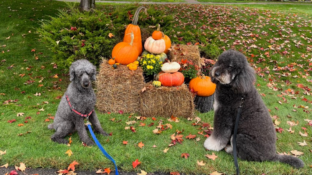 On our second walk of the day, I had the dogs pose by a vignette of pumpkins, squash, mums, and hay bales arranged by one of my mom’s neighbors. I’m going to have a 5 x 7-inch photo made and frame it, a reminder of a gray but lovely autumn day when two big-hearted dogs kindly let me take their picture on a blustery day.