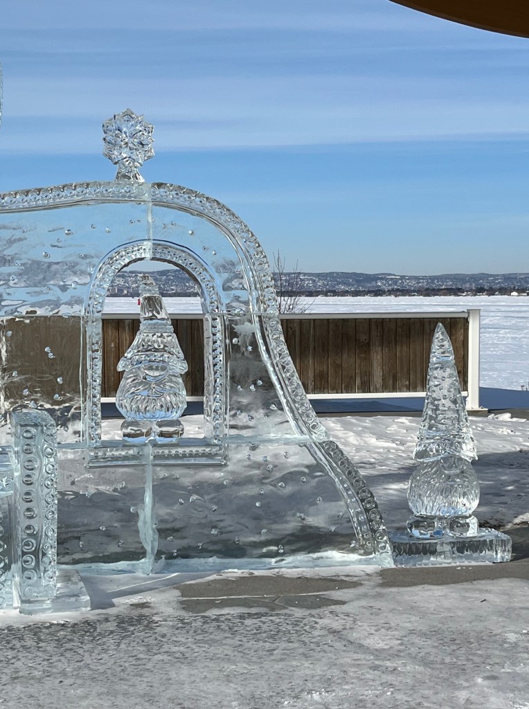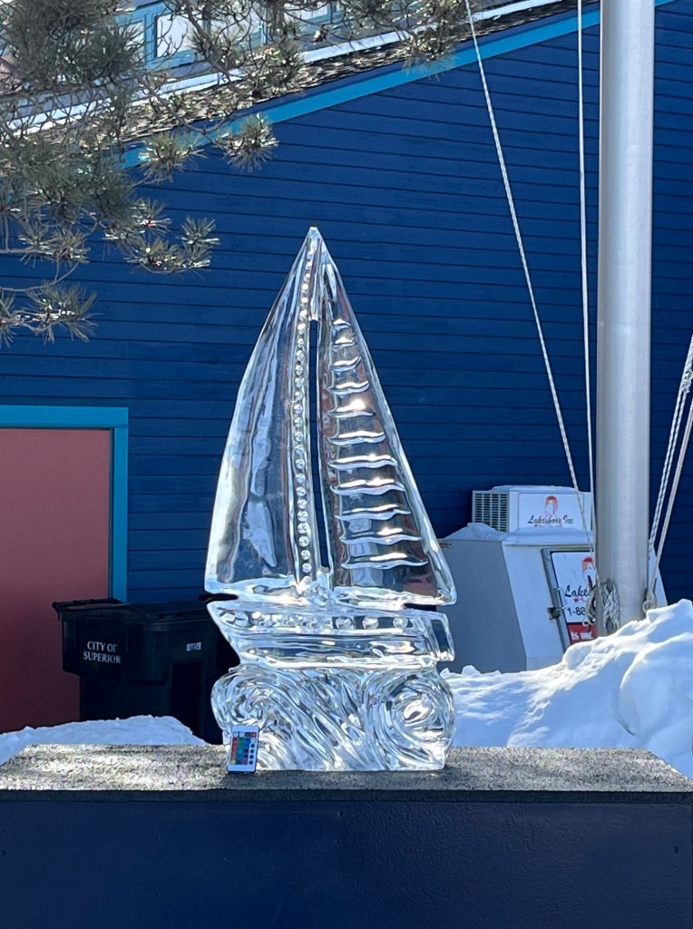 Across from Paul Bunyan’s abandoned marbles, were two of the prettiest ice sculptures. I don’t know what they symbolize, but I imagine they have a connection to sailors and ships and open waters. In the left photo in the background is the Seaman’s Memorial, a statue dedicated to sailors who have lost their lives on Lake Superior.