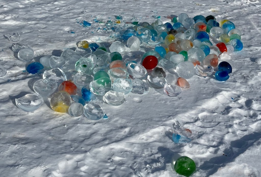 After photographing the ice sculptures downtown, I headed for Barker’s Island, the site of the festival, to track down more sculptures. When I parked the car, I spotted a large pile of misshaped ice marbles. They were part of the winter festival, but I’m not sure how. I liked thinking about them as giant marbles left behind by Paul Bunyan. I loved playing marbles when I was in second grade, and I could beat all the boys. In fifth grade I played Babe the Blue Ox in a play. I made my own costume by cutting out the silhouette of an ox from cardboard and painting it blue. When I was on stage, I was always behind the cardboard ox, and I had no lines, so I didn’t discover I had stage fright until I played the Wizard in the Wizard of Oz in seventh grade.