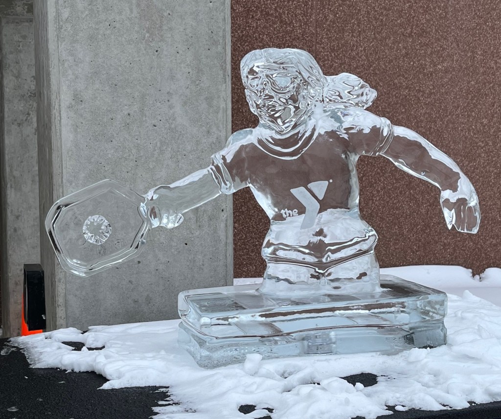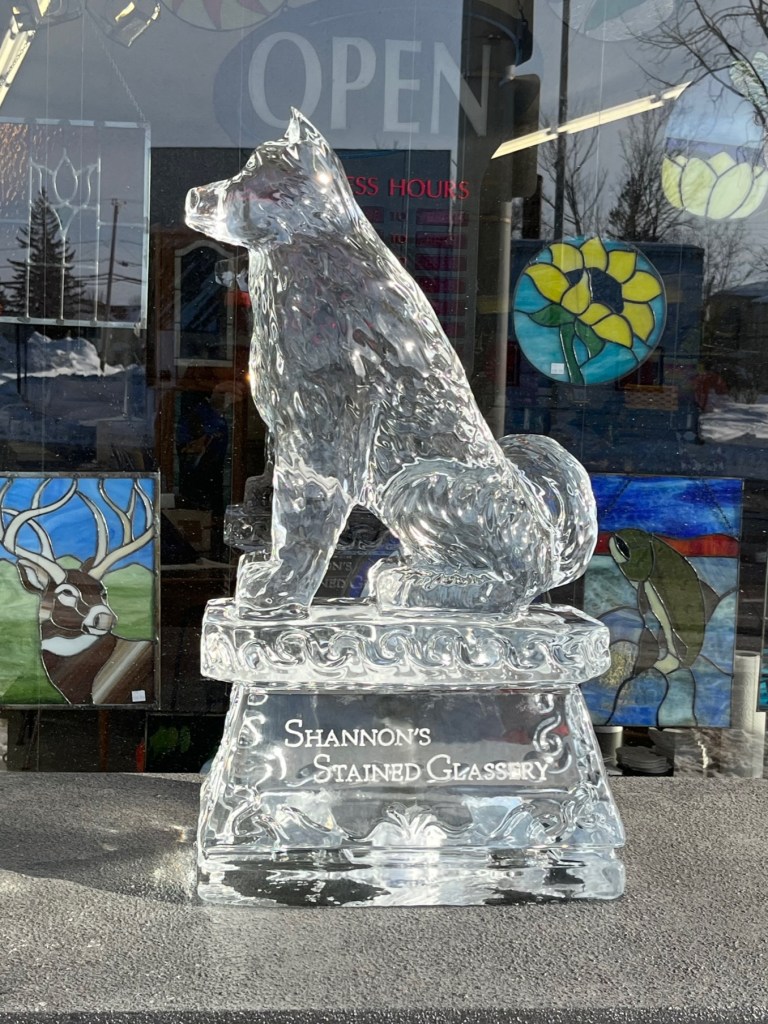 Pretending my phone was a righteous 35mm with a telephoto lens of phallic proportions, I fancied myself a photojournalist. (Hey, it’s my Walter Mitty fantasy.) I started my ice sculpture treasure hunt with some coin in the bank because I had already photographed the icy racquetball player in front of the YMCA when I dropped my grandson off at his 3K school on Wednesday, and I had snapped a picture of the sculpture in front of the vet’s when I dropped off a urine sample for Cabela on Friday. Years ago, I played many racquetball games with a college friend at the Y. The vet who takes care of my dogs was a former student of mine, and she has cared for all of our dogs accept the first one my husband and I had. My ice safari would turn out to be a trip down memory lane.