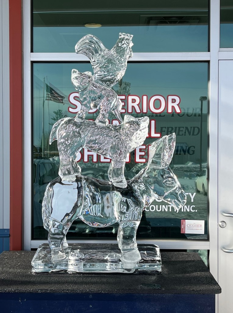 And on a happier note, my favorite ice sculpture, “The Town Musicians of Bremen,” was sponsored by the animal shelter. As a child, the story by the Brothers Grimm was one of my favorites. Turns out the four famous animal musicians have statues of themselves in Bremen, Germany, the Lynden Sculpture Garden in Milwaukee, and in front of some veterinary schools in Germany. (You can listen to the story here.)