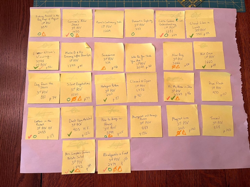 A short while later, I received my last reader’s list of favorites. Using Post-its on a large piece of newsprint, I moved story titles around until I was happy with their sequence. I copied and pasted the stories into one document then reviewed it. I filled out the electronic submission form and uploaded my file. After a slow inhale, I clicked submit, then exhaled. My stories had left the station on their first adventure. I won’t hear about them until January 2024. In the meantime, I will keep reading and learning and writing.