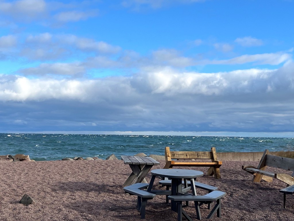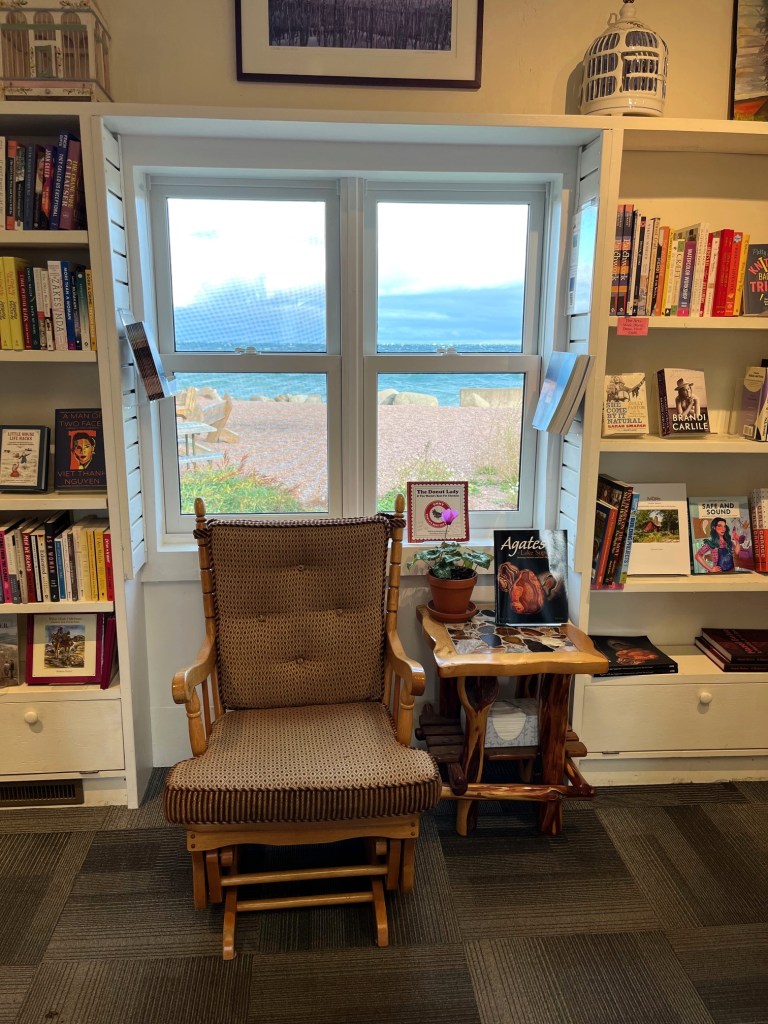 Last October my sister and I actually visited Drury Lane three times in one weekend. (I bought a collection of short stories and two novels.) During our first visit, the churning waves on Lake Superior roared so loudly that conversation outside the bookstore was difficult, unless we wanted to shout. And while we could have sat in the wooden chairs on the beach and read our new books, the cold, strong-fisted winds would have ripped pages from our hands. The next day the winds abated, but it was still chilly. So, we read our books in a local coffeehouse while sipping hot mugs of tea and coffee.