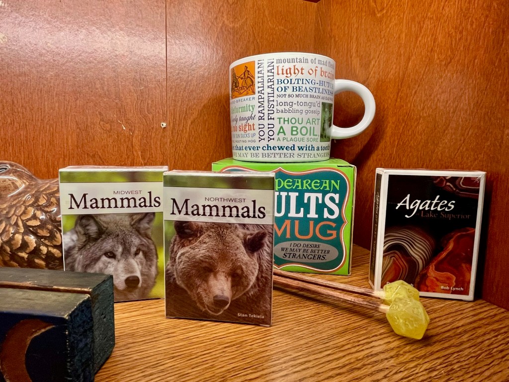 Playing cards and coffee cups. Note, the coffee mug features Shakespearean insults. Should you have a lover’s spat — you can trade first-rate barbs by the bard.