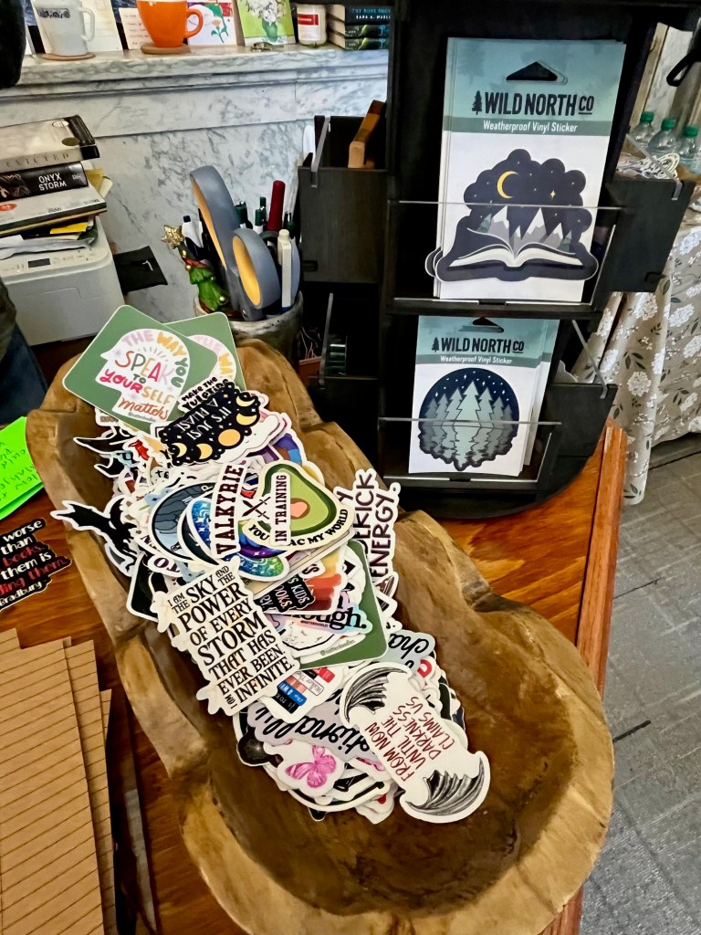 Stickers! Think of these like the Valentines we gave each other in elementary school. People like to put these on travel mugs and computers. I like to put mine on the inside of my writing journals.