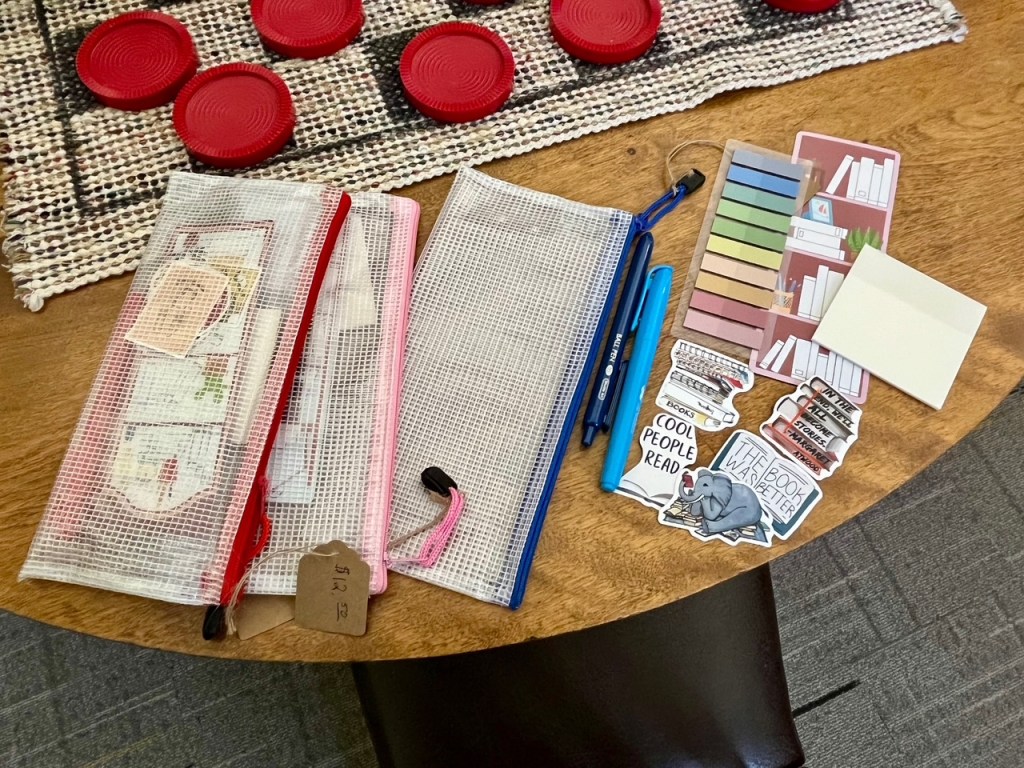 Pencil cases filled with stickers, sticky notes, tabs, a bookmark, a pen, and a highlighter