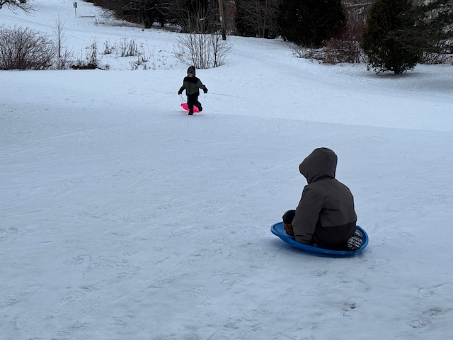 On Monday and Tuesday, both warm winter days, my grandkids and I drove by Central Park numerous times while running errands. Not the famous 843-acre Central Park in New York City, but the Central Park in my hometown, around ten acres in size. Each time we drove by, we saw children sledding down the hills at the western side of the park.