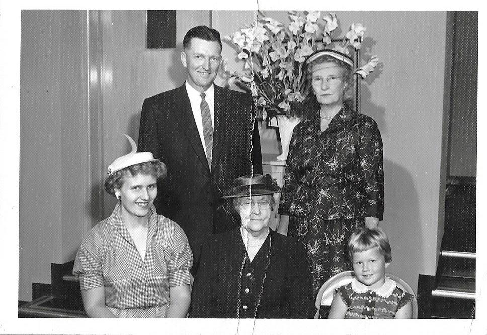 Five generations. Seated, L to R: Audrey (Malene’s great-granddaughter); Malene; Jennifer (Malene’s great-great-granddaughter); Standing: George (Malene’s grandson); Alpha (Malene’s daughter)