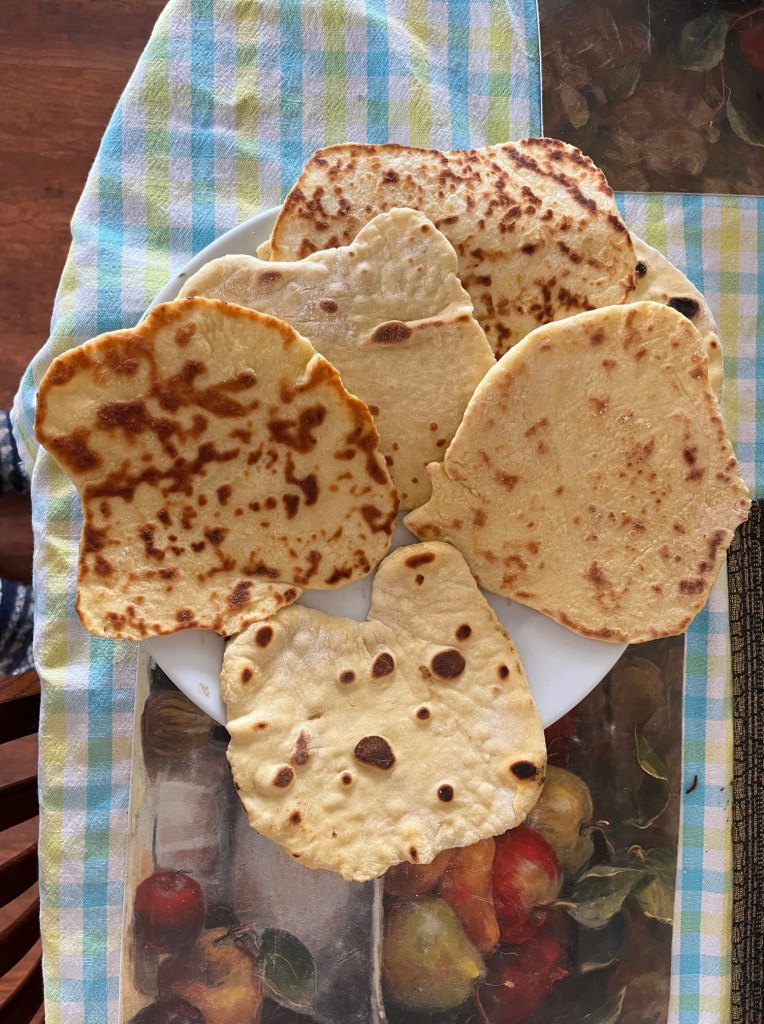 After the naan bread dough finished rising, I divided it into eight sections, rolled each one into a flat six-inch circle — more or less — and fried each piece. I set off the smoke alarm, but only once. I made a mess out of my kitchen. When I finished there were dishes all over the countertops and stove, and I found flour on the floor. I don’t know how I can cook something and make so many dirty dishes and create such a mess. I guess it’s a gift.