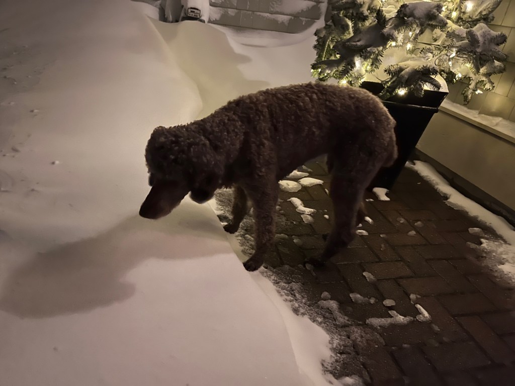 This Christmas morning it was my two dogs, Cabela and Ziva, who woke me up around six o’clock. They weren’t interested in presents–they wanted to go outside in the windy, windy snowstorm and pee. After we came back inside, my mother’s dog, Bogey, wanted to go outside, so back out I went, but I left Cabela and Ziva in the house.