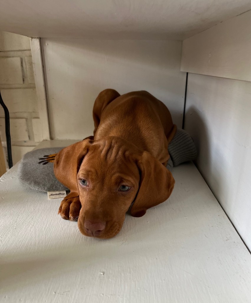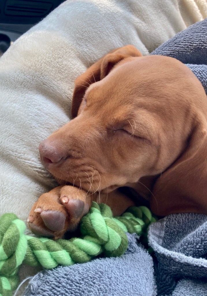My new grand-dog Nellie is a soft, snuggly, copper-colored Vizsla with sapphire-blue eyes, which will turn green as she matures. She’s nine weeks old, and she’s already a linguistic genius.