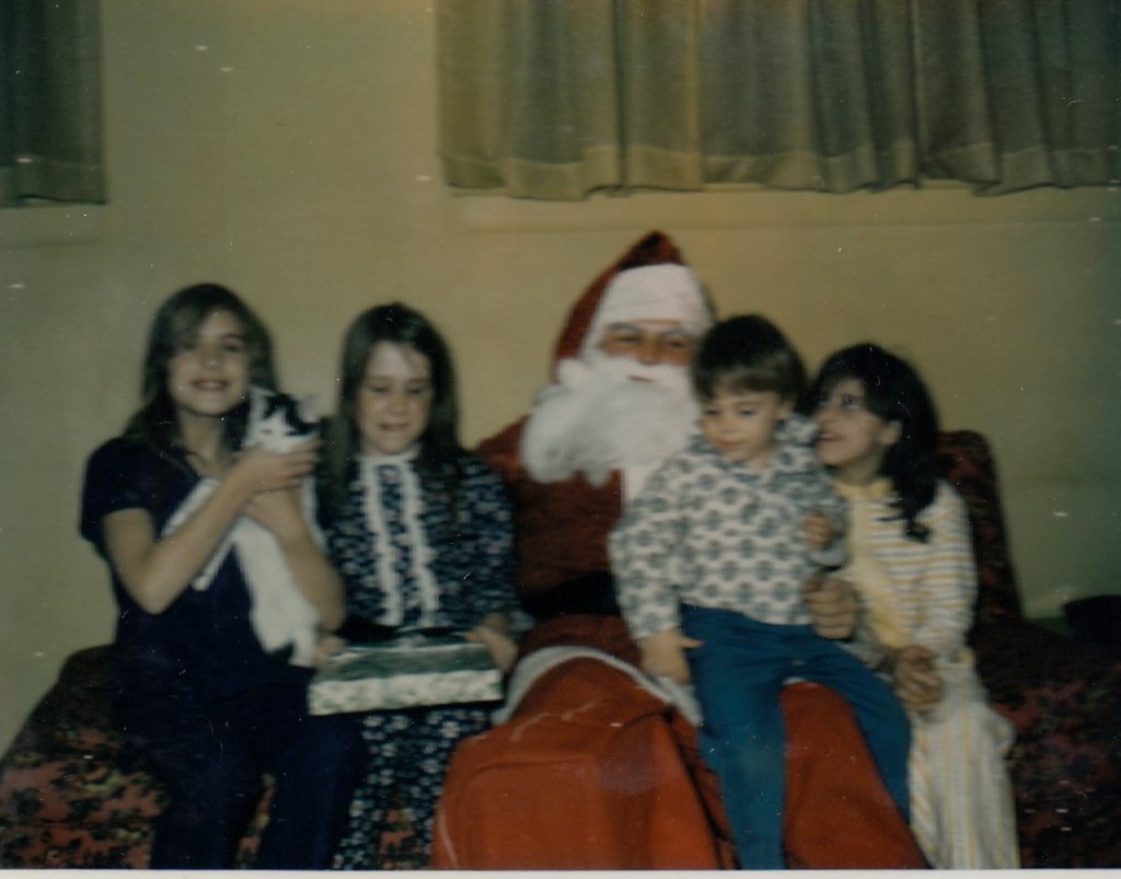 My sisters, my brother, and I enjoy a visit from St. Nick. (I’m holding the present.) The cat was not a present. He was a stray we adopted and named George, after our grandpa.