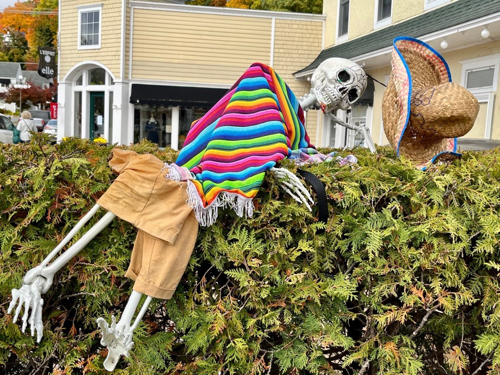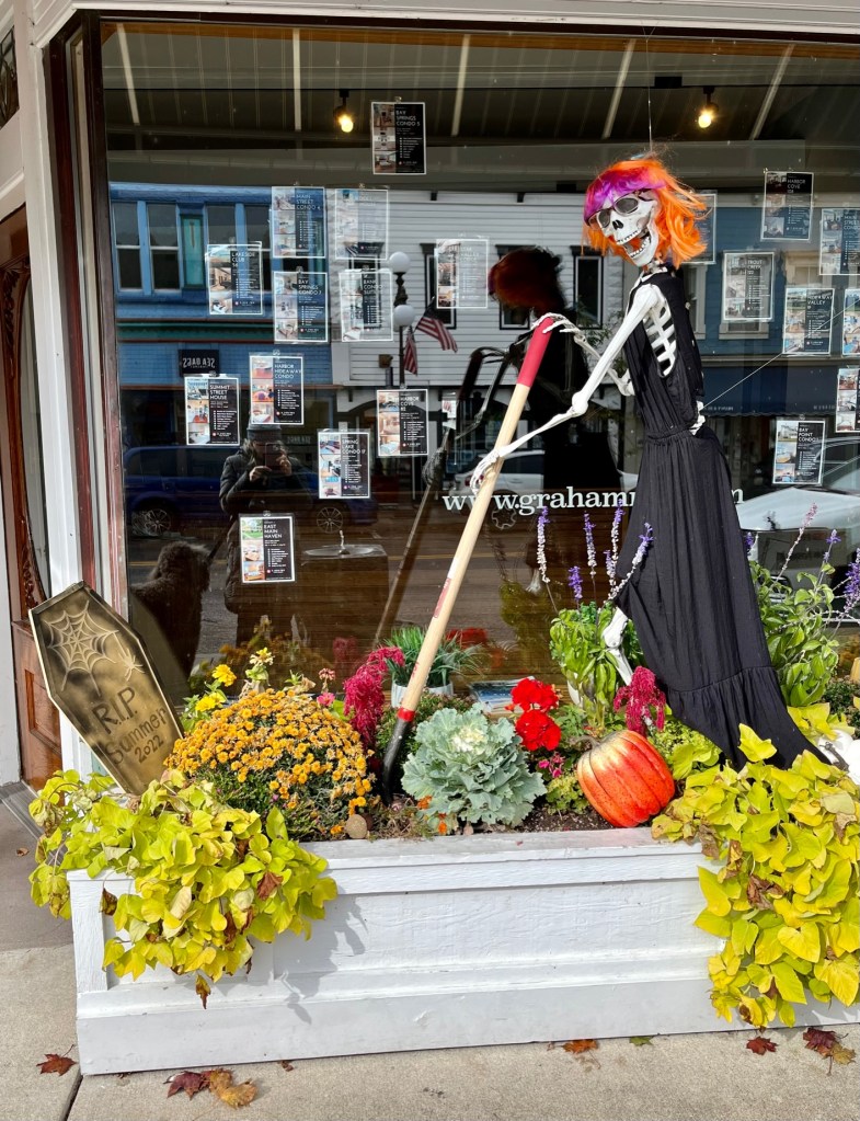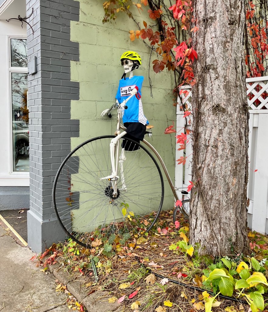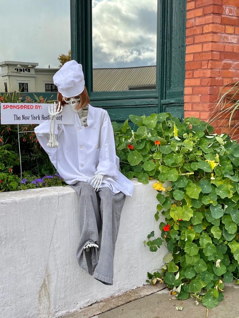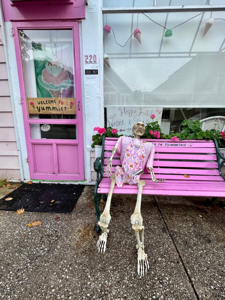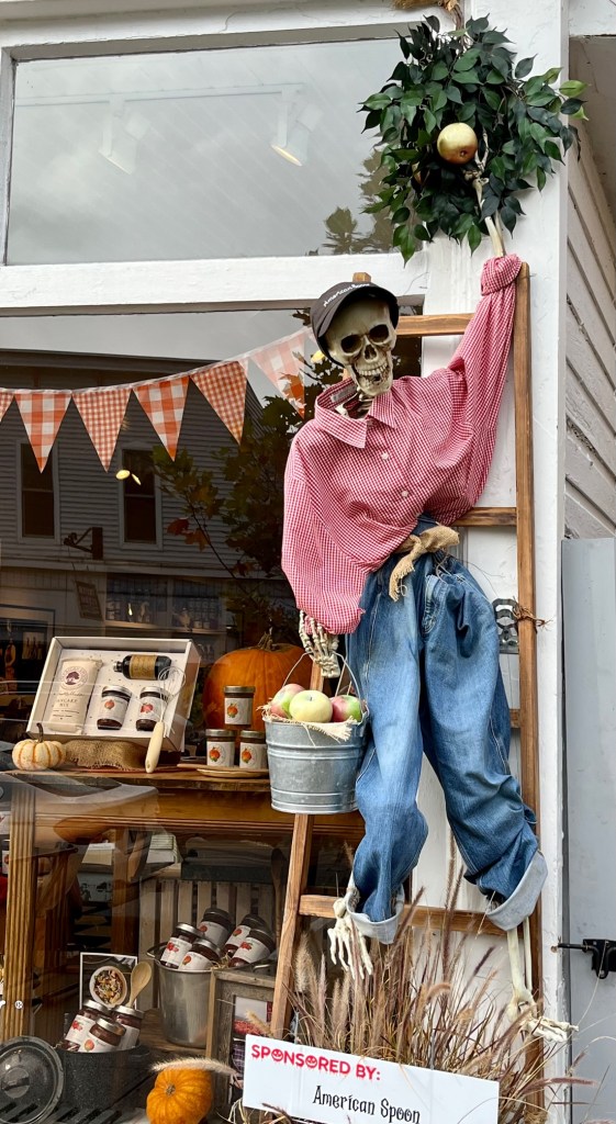 Next, we headed back to Main Street, where I noticed boney visitors who’d stopped by Harbor Springs dressed for Halloween. Bogey had to wait for me while I walked up and down the sidewalks and photographed twenty-seven snappily-dressed skeletons. I know I didn’t get pictures of all the skeletons, but I had fun trying to find as many as I could. Excitement lurked on every block and around every corner. Costumed skeletons have become a Harbor Springs Halloween tradition. And this year there are seventy-five skeletons creaking about.