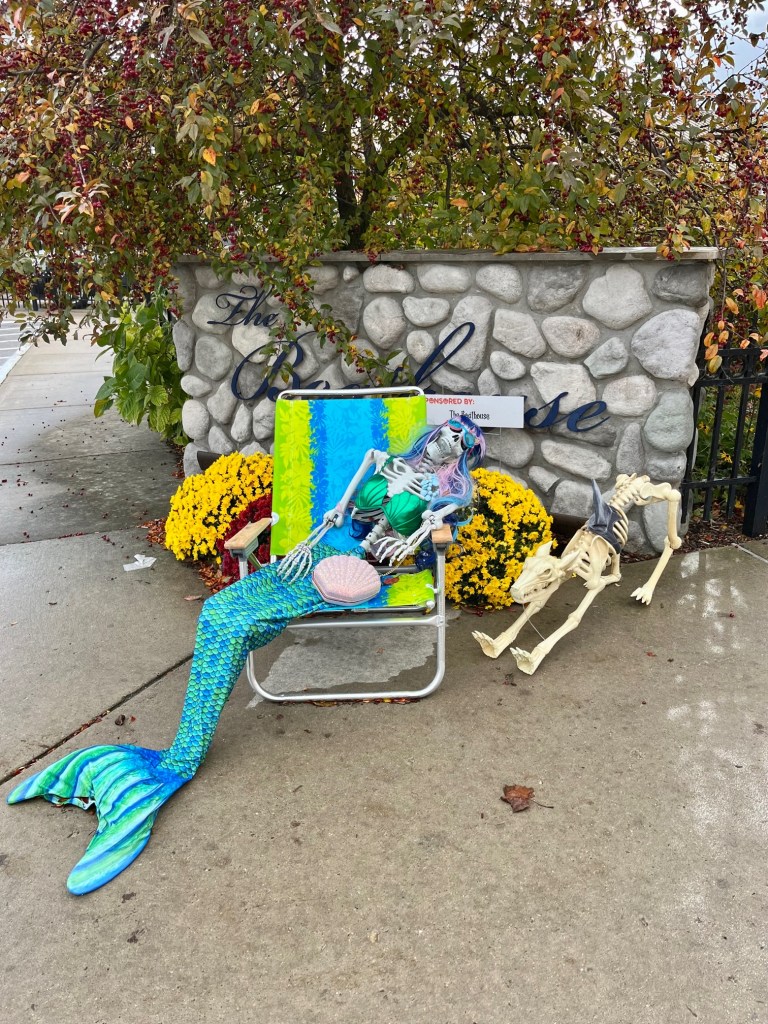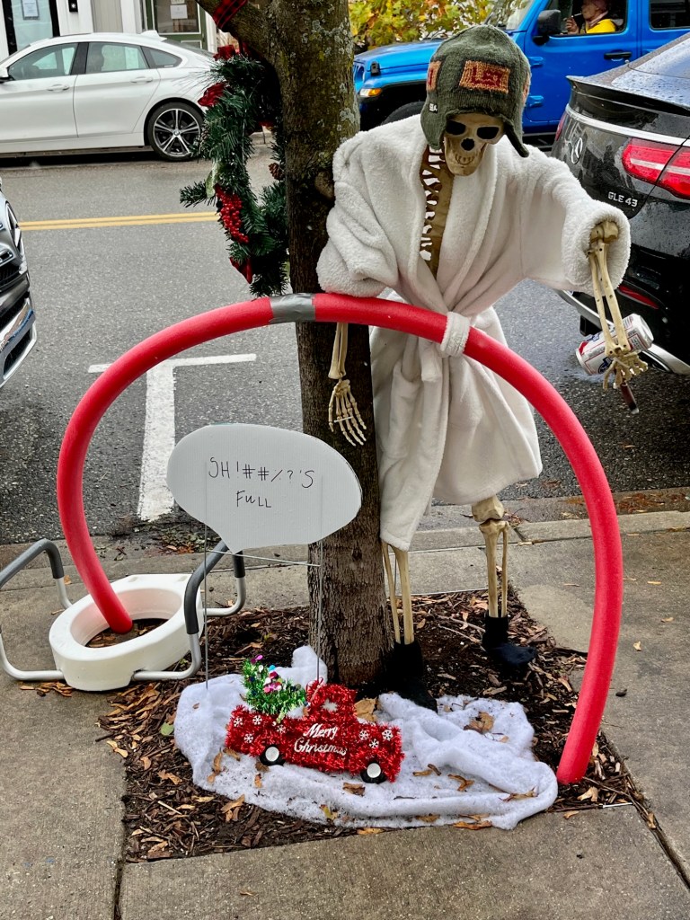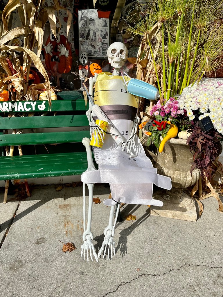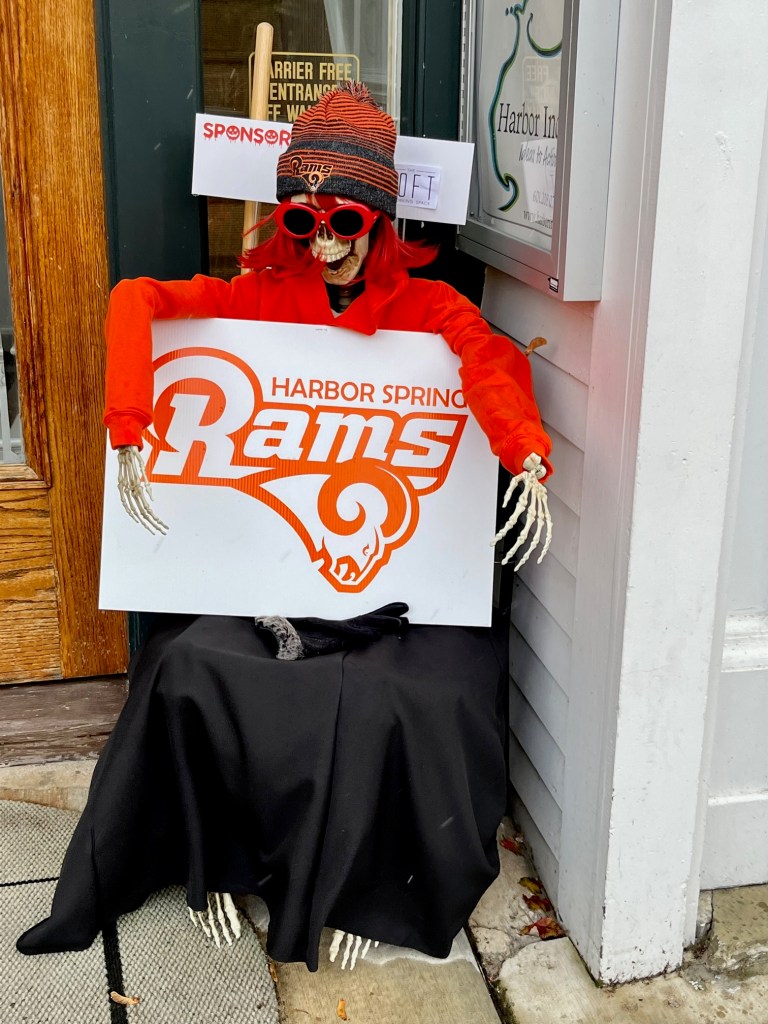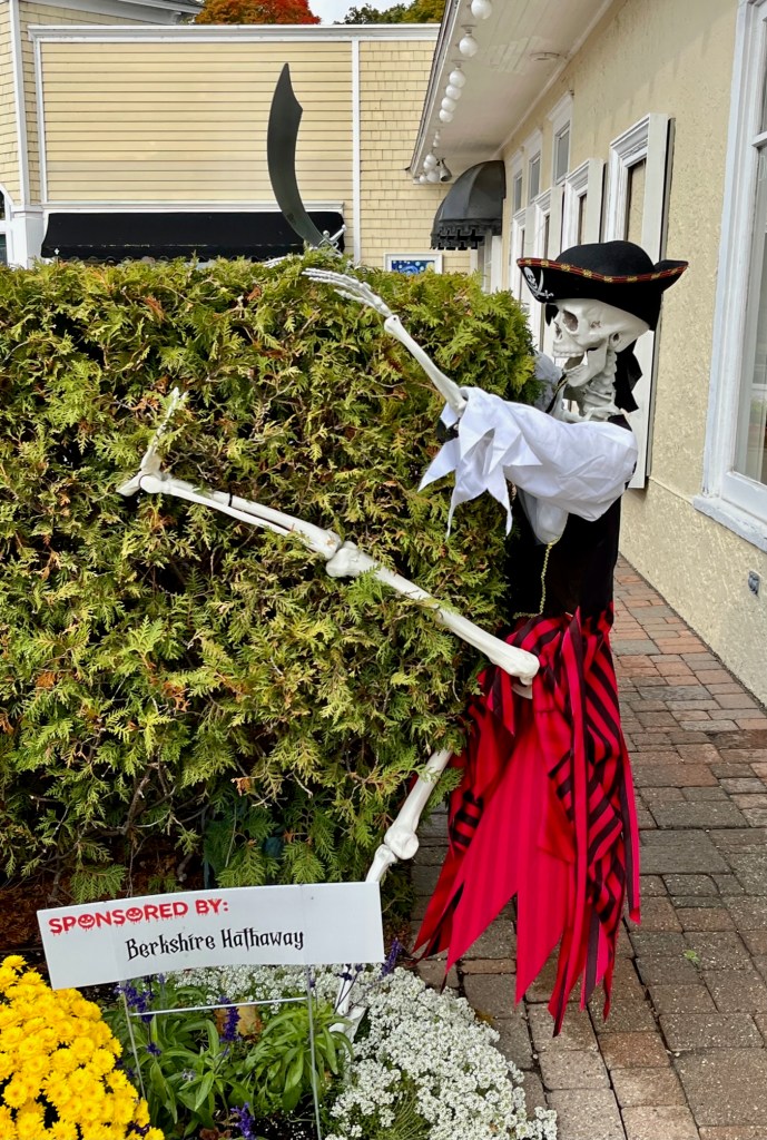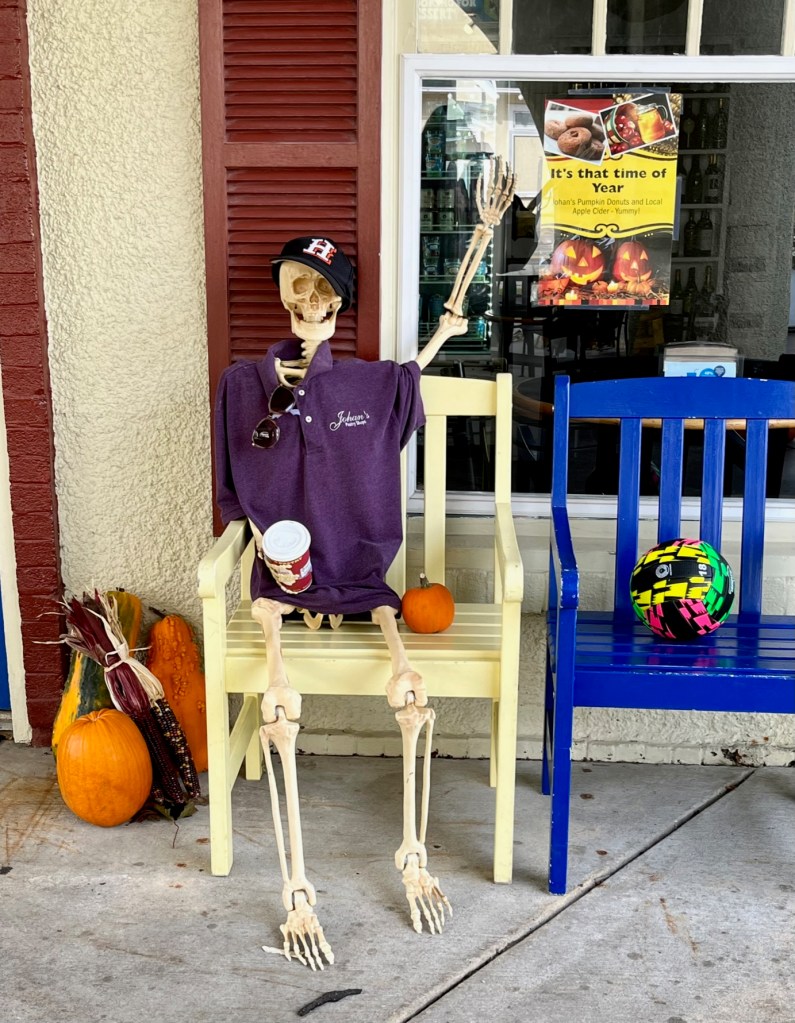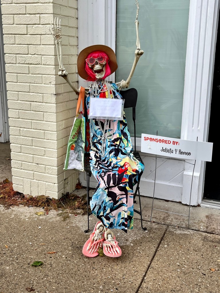 Next, we headed back to Main Street, where I noticed boney visitors who’d stopped by Harbor Springs dressed for Halloween. Bogey had to wait for me while I walked up and down the sidewalks and photographed twenty-seven snappily-dressed skeletons. I know I didn’t get pictures of all the skeletons, but I had fun trying to find as many as I could. Excitement lurked on every block and around every corner. Costumed skeletons have become a Harbor Springs Halloween tradition. And this year there are seventy-five skeletons creaking about.