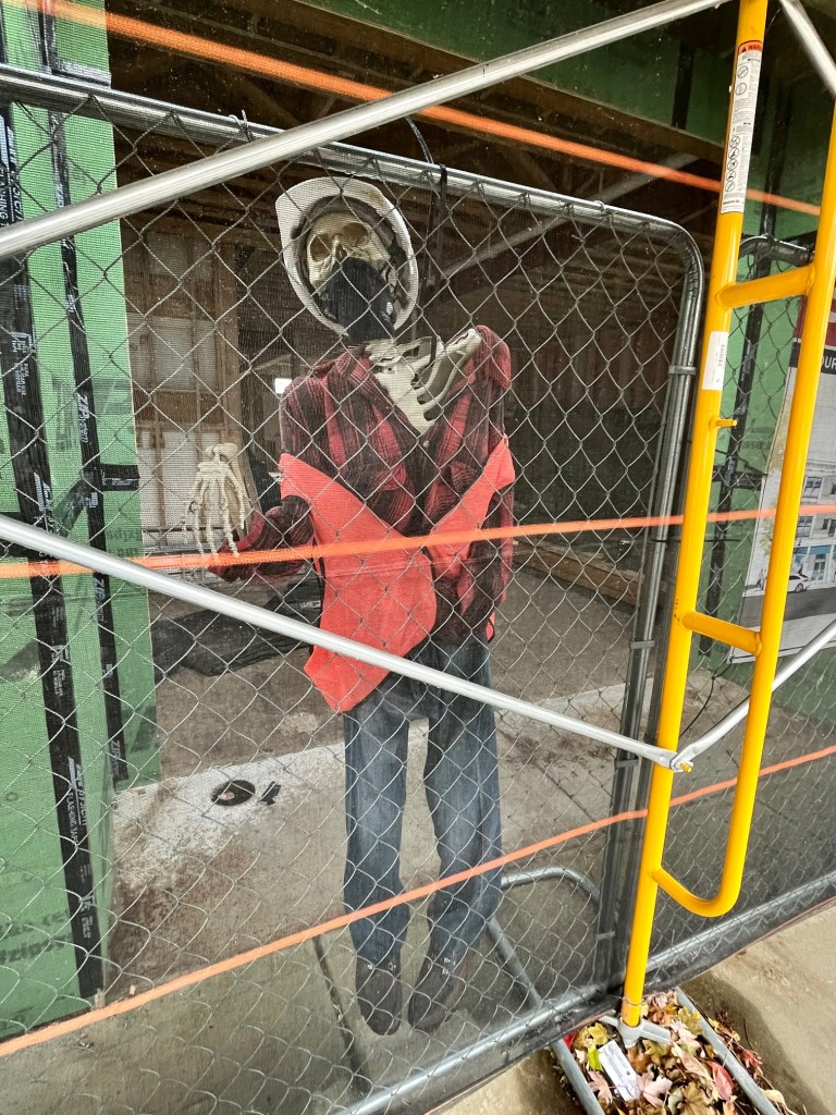 Tonight the wind howls off Lake Michigan, and it’s raining in spurts. In the hours before dawn, snow is expected before turning back to rain. The National Weather Service has issued a wind advisory. And I wonder how the skeletons will stay warm in all this weather–they don’t have any meat on their bones.