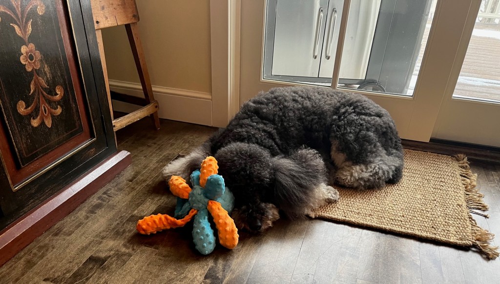 I gave Bogey his Christmas present, a colorful stuffed octopus. He played with it for a bit, then napped with it on the kitchen floor. With all three dogs in the house fast asleep, I made coffee.