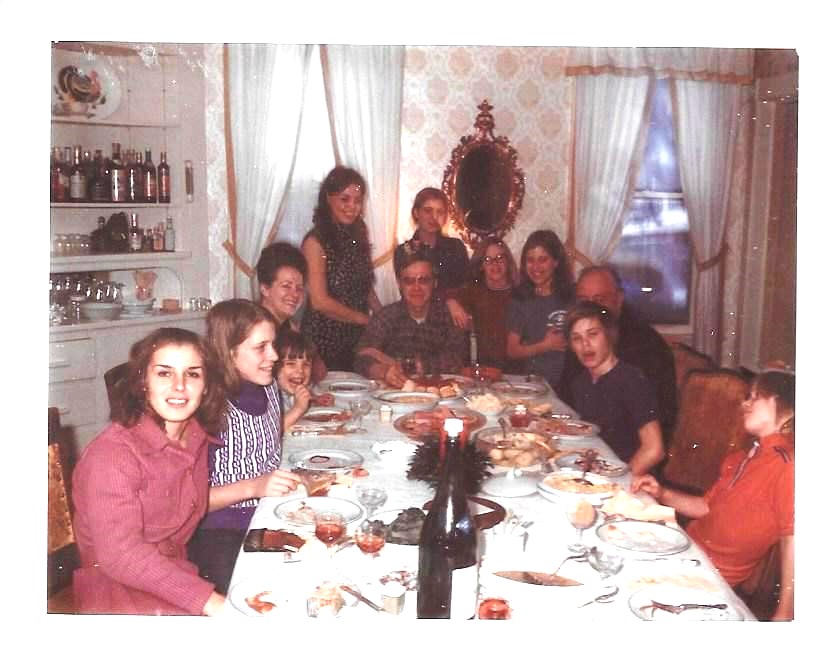 Christmas dinner. From the left and clockwise: Auntie Pat, me, Steve, Nana, Mom, Uncle Fred, Kimberly, Dee Dee, Suzanne, Grandpa Howard (who had recently married Nana) Brian, and Lisa. My father took the photo, circa 1972.