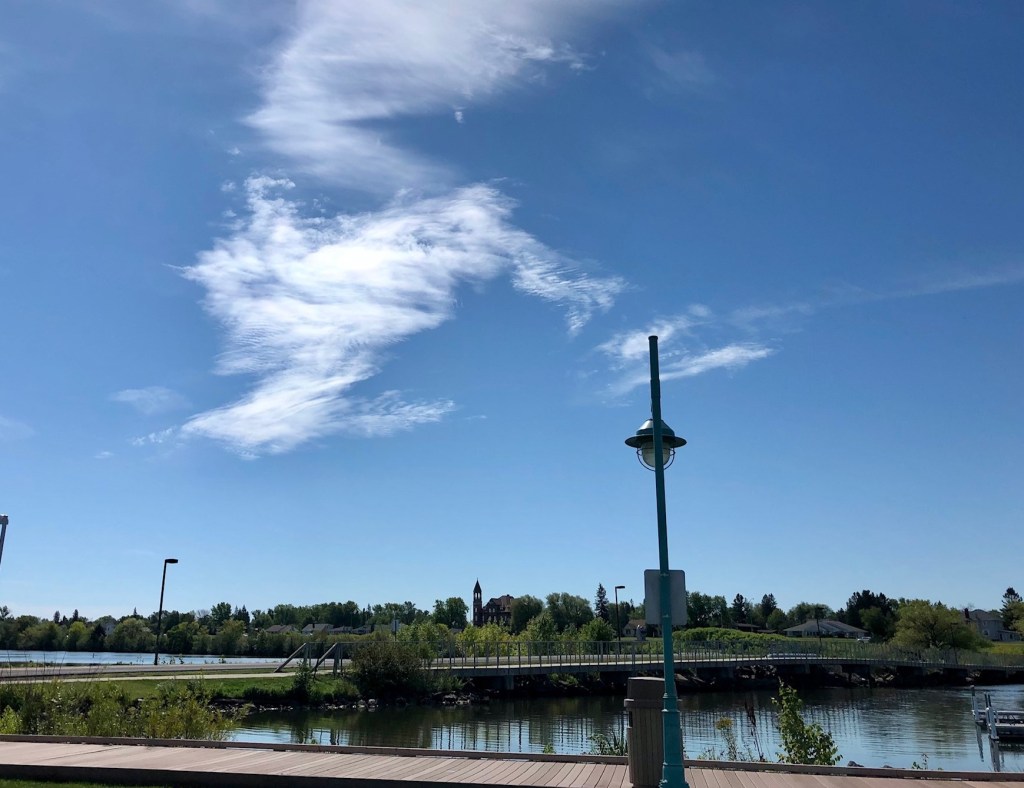 After I rounded the tip of the island and entered the calm waters on the marina side, I stood up, slowed down, and looked around. The jubilant sky was azure blue with wispy clouds, as if Bob Ross had painted them with a wide brush, using bold, sweeping strokes of brilliant white paint, while cooing, “Let’s add happy clouds in the sky.”