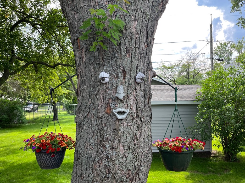 Tree Guy’s looking good, but Friday morning I discovered a squirrel had messed with one of his earrings. Every summer I forget about the hooligan squirrels until I find dirt and a section of flowers on the ground. Searching for an easy place to bury seeds for the next winter, squirrels dig in the flower baskets hanging from Tree Guy’s earlobes. Joke’s on the squirrels because I empty the baskets in the fall and return them to the farmers market so they can be reused. I stuck bamboo kabob skewers in the baskets and made plans to replace the damaged flowers. Yesterday morning I discovered one of the skewers on the ground, no doubt used as a javelin by one of the wayward squirrels.